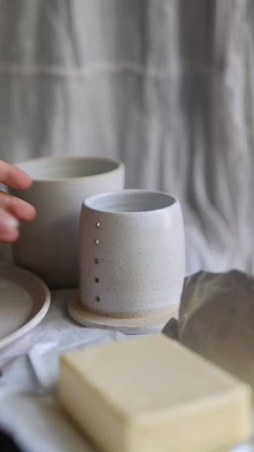 Handgedrehte franz. Butterdose aus hochwertigem beige-gesprenkeltem Steinzeugton. Innen und außen weiß-matt glasiert.