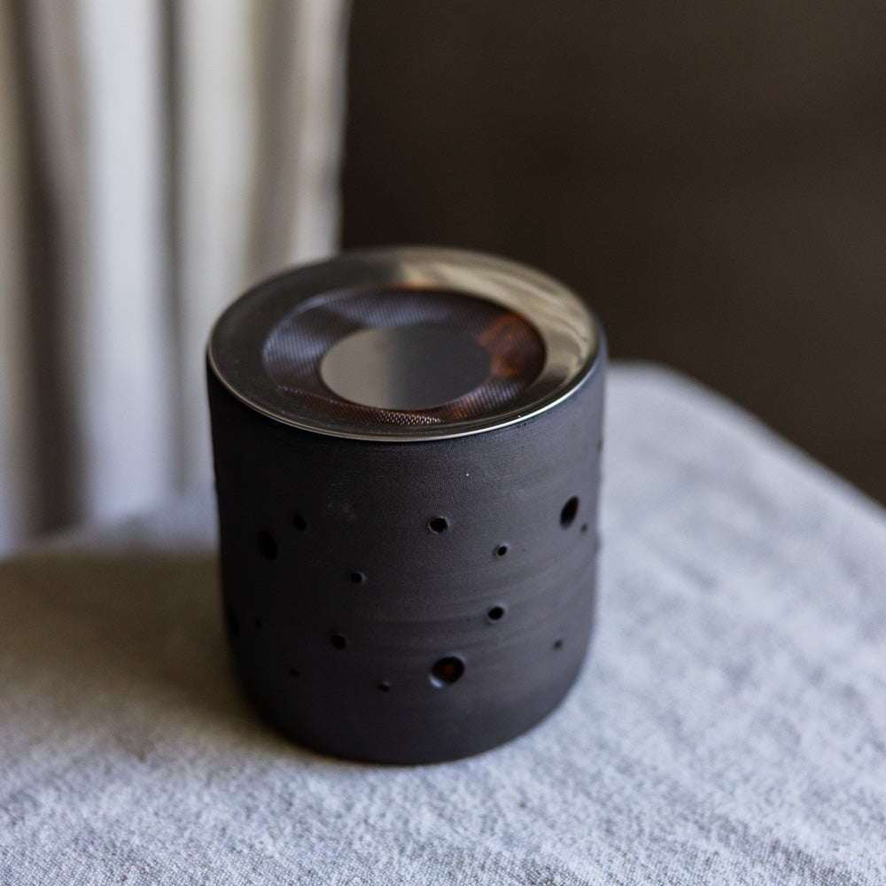 Dieses handgetöpferte Räucherstövchen aus edelmattschwarzer Keramik bringt Stil und Ruhe in deine Räucherrituale. Das Edelstahlsieb mit Schutzblättchen verhindert das Einharzen und eignet sich perfekt zum sanften Räuchern von Harzen, Kräutern und Mischungen.