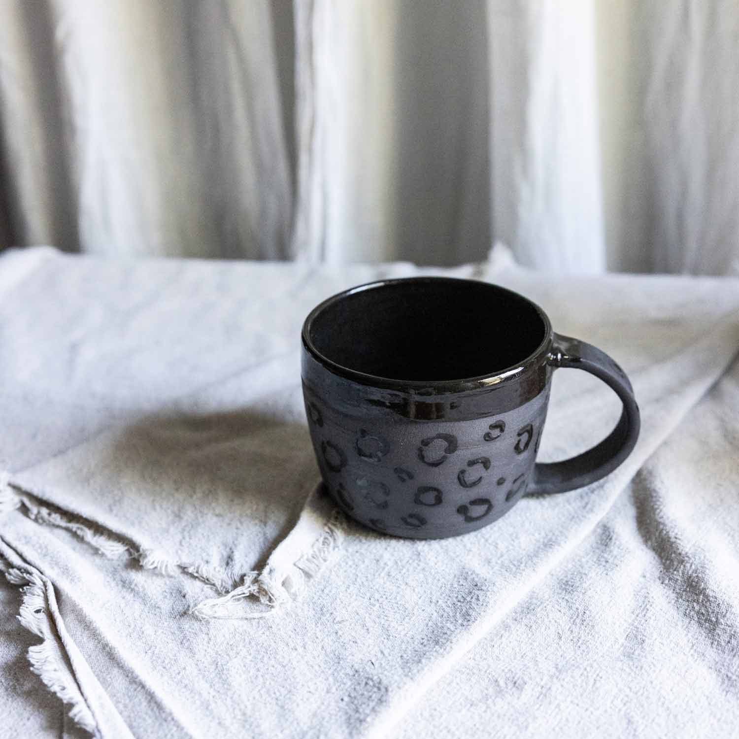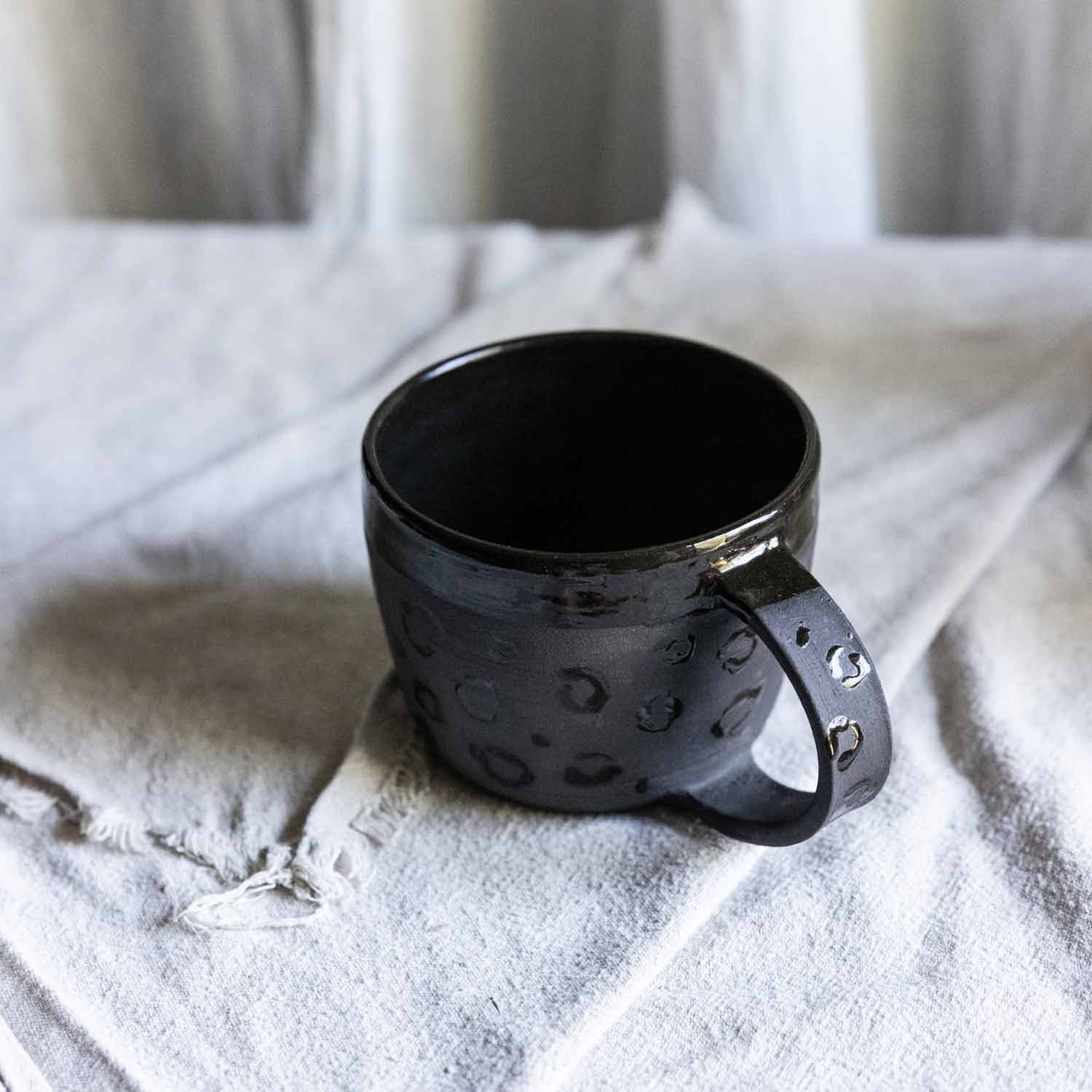 Handgedrehter Cup aus hochwertigem schwarzem Steinzeugton mit handgemaltem Leo-Design in schwarzglänzend verziert.