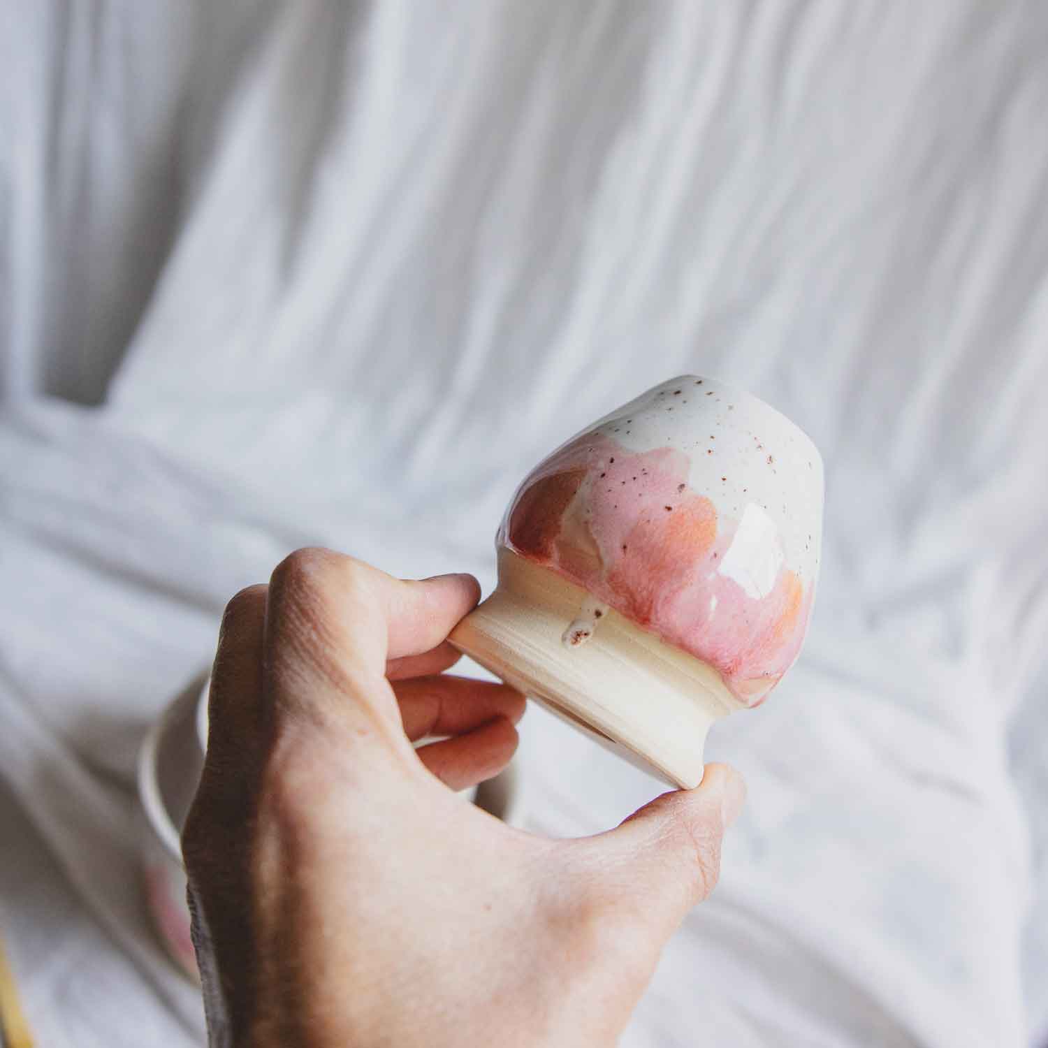 Handgedreht aus hochwertigem cremfarbenem Steinzeugton, und mit einer spannend verlaufenden Glasur von weiß gesprenkelt nach pink-rot, ist das ein Matcha-Set der Extraklasse. Leider ist die Glasur nicht an allen Stellen gleichmäßig verlaufen - deshlab gibt es uns günstiger. Siehe Bilder.