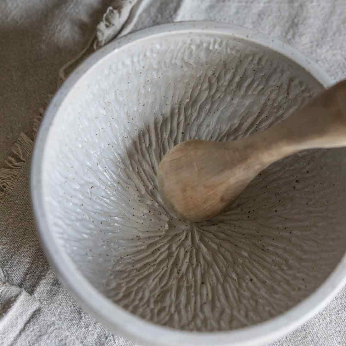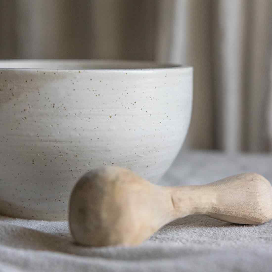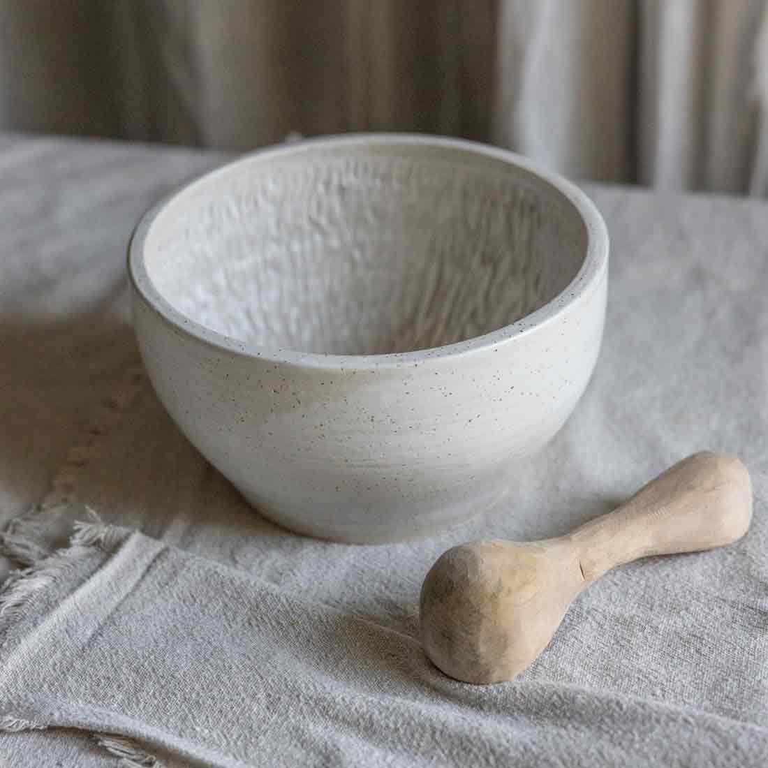 Gefertigt aus creme-gesprenkeltem Ton und glasiert einem sanften matten weiß. Diesen Mörser gibst du nie mehr her!