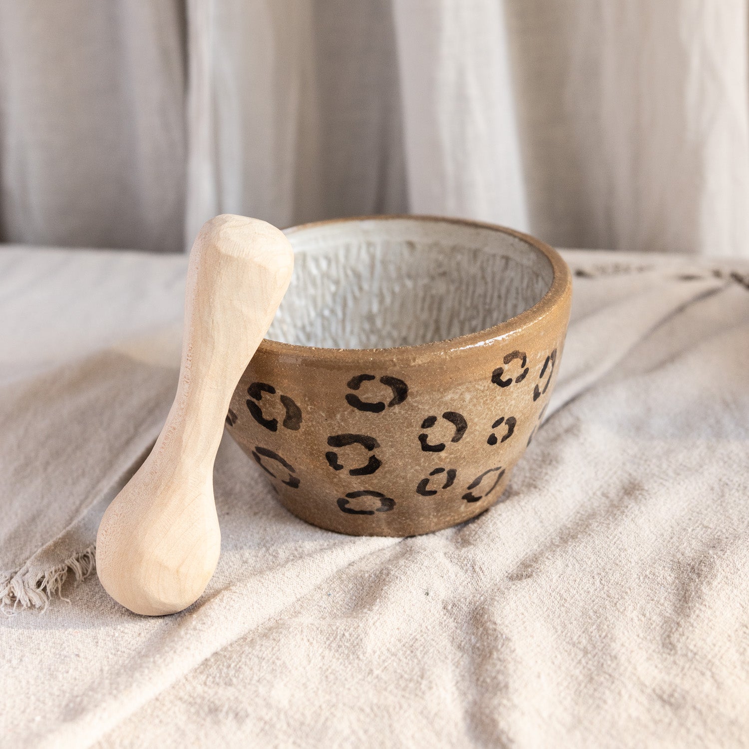 Leo-Mörser, gefertigt aus lederfarbenem Ton mit Leomuster.