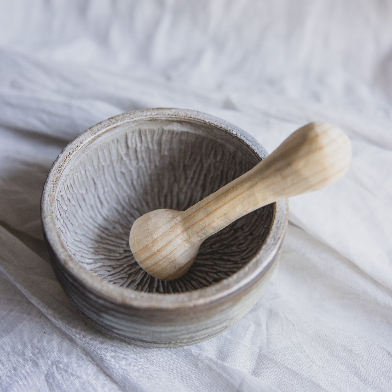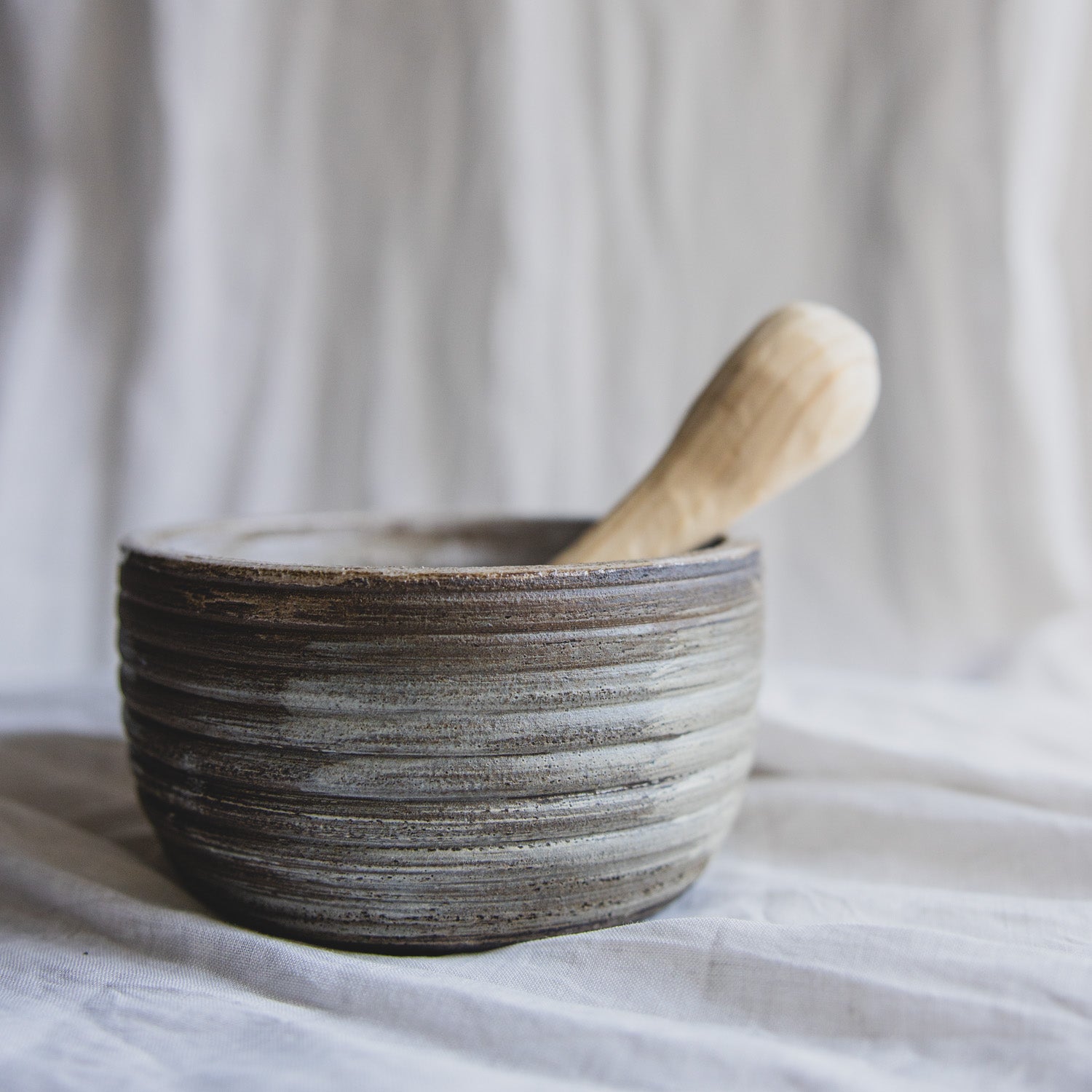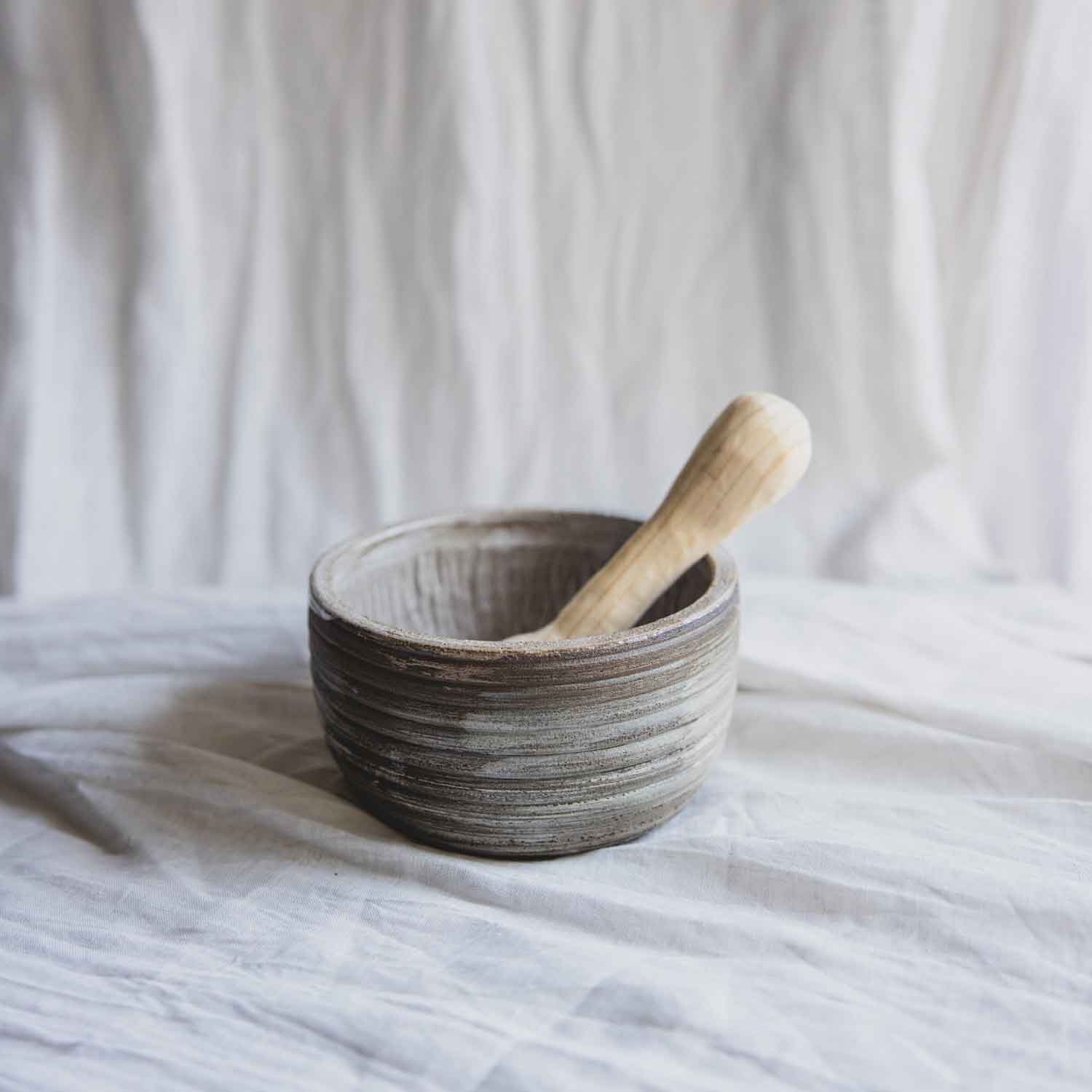 Ganz neu in der Mörser-Kollektion, der unaufgeregte sanfttönige Mörser aus grau-braunem Ton. Verziert mit einem minimalistischen Linienartigen Äußeren, für besseren Halt.