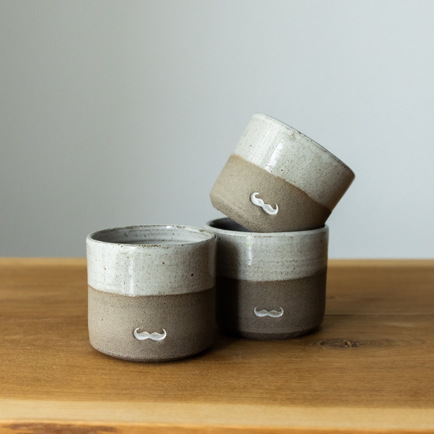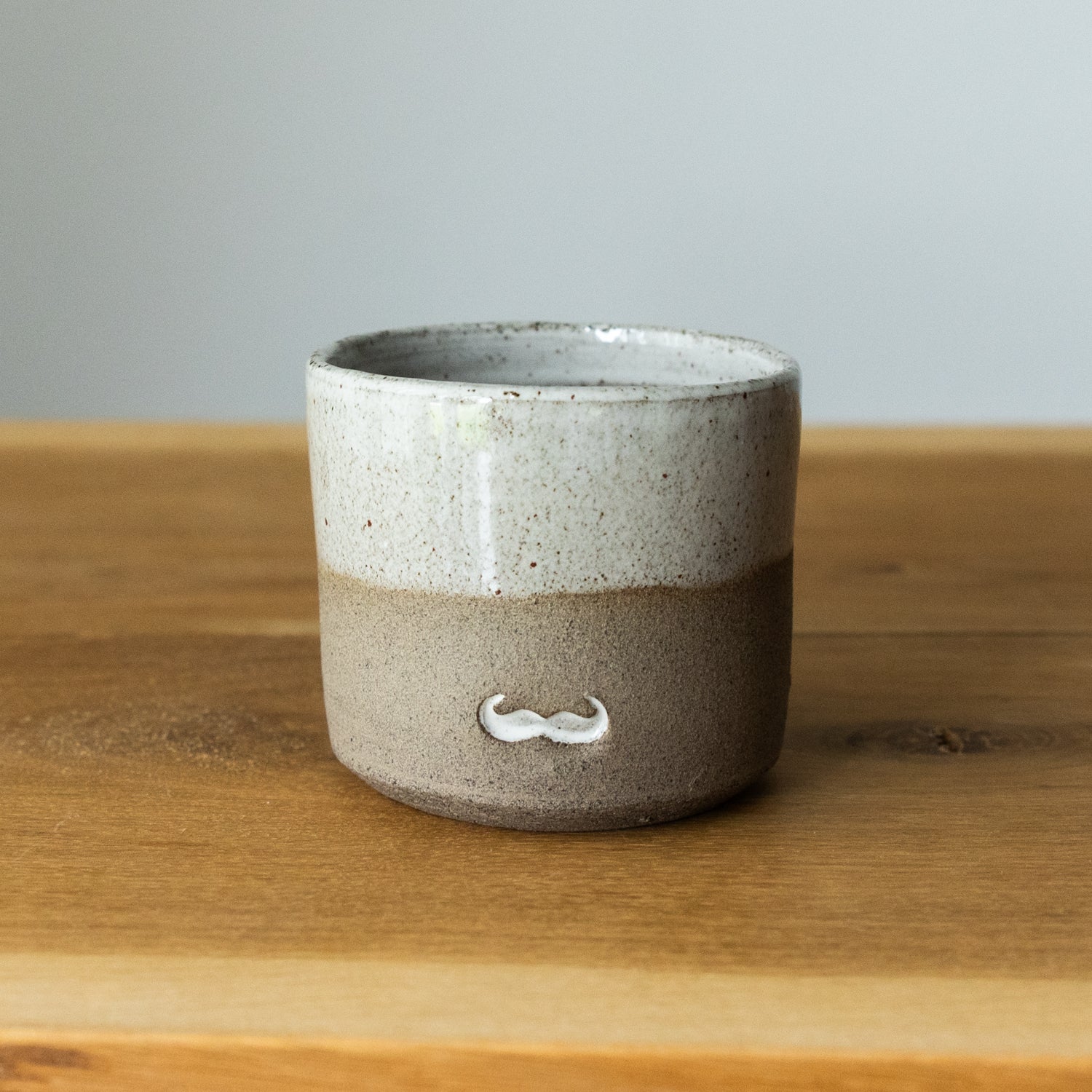 Handgedrehter Cup aus hochwertigem grauem Steinzeugton mit handgemachtem Schnurri-Symbol.