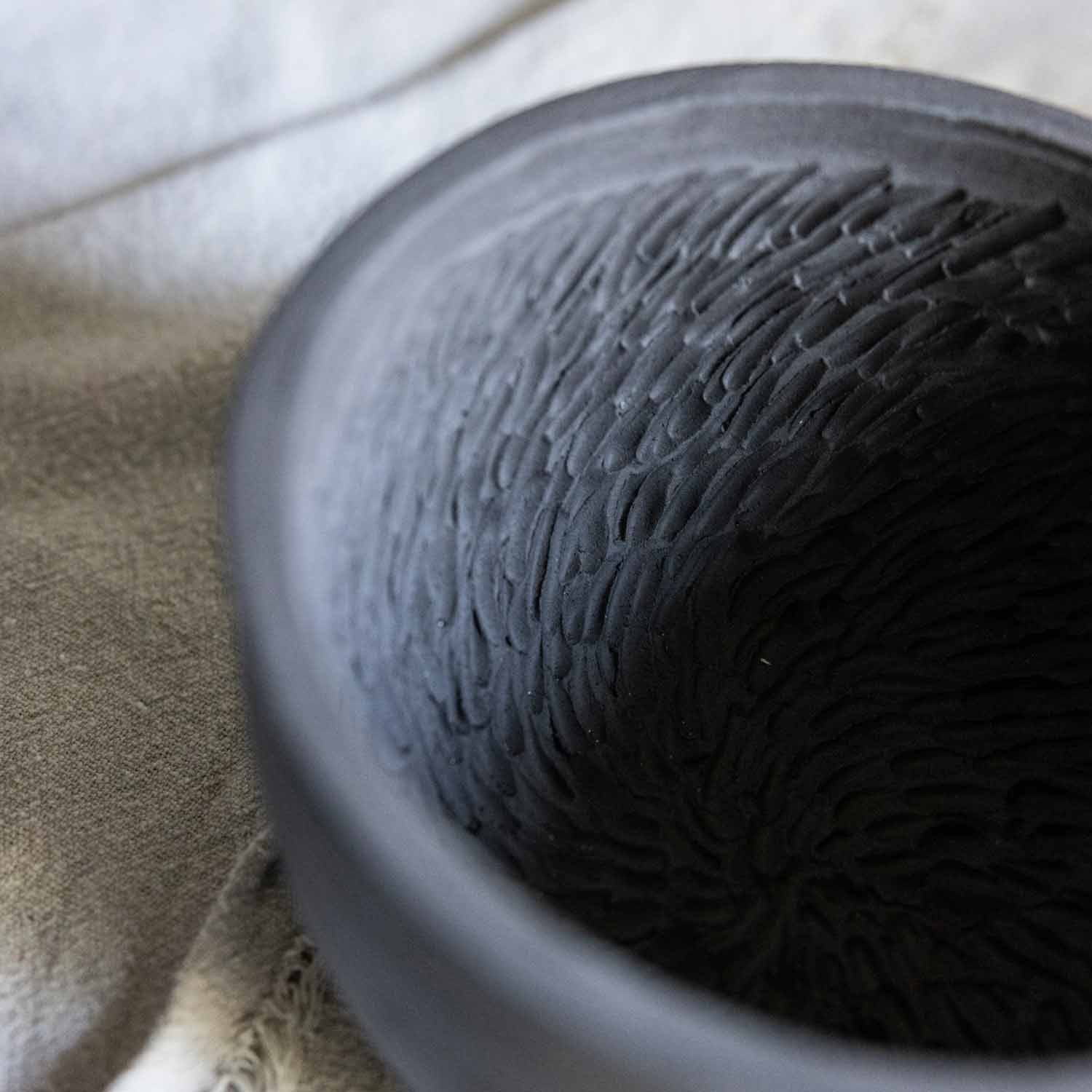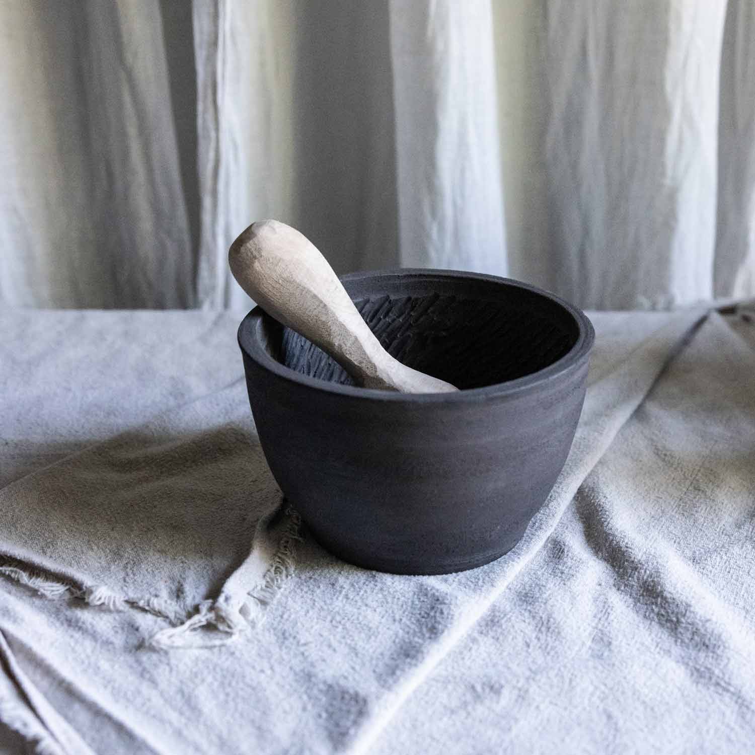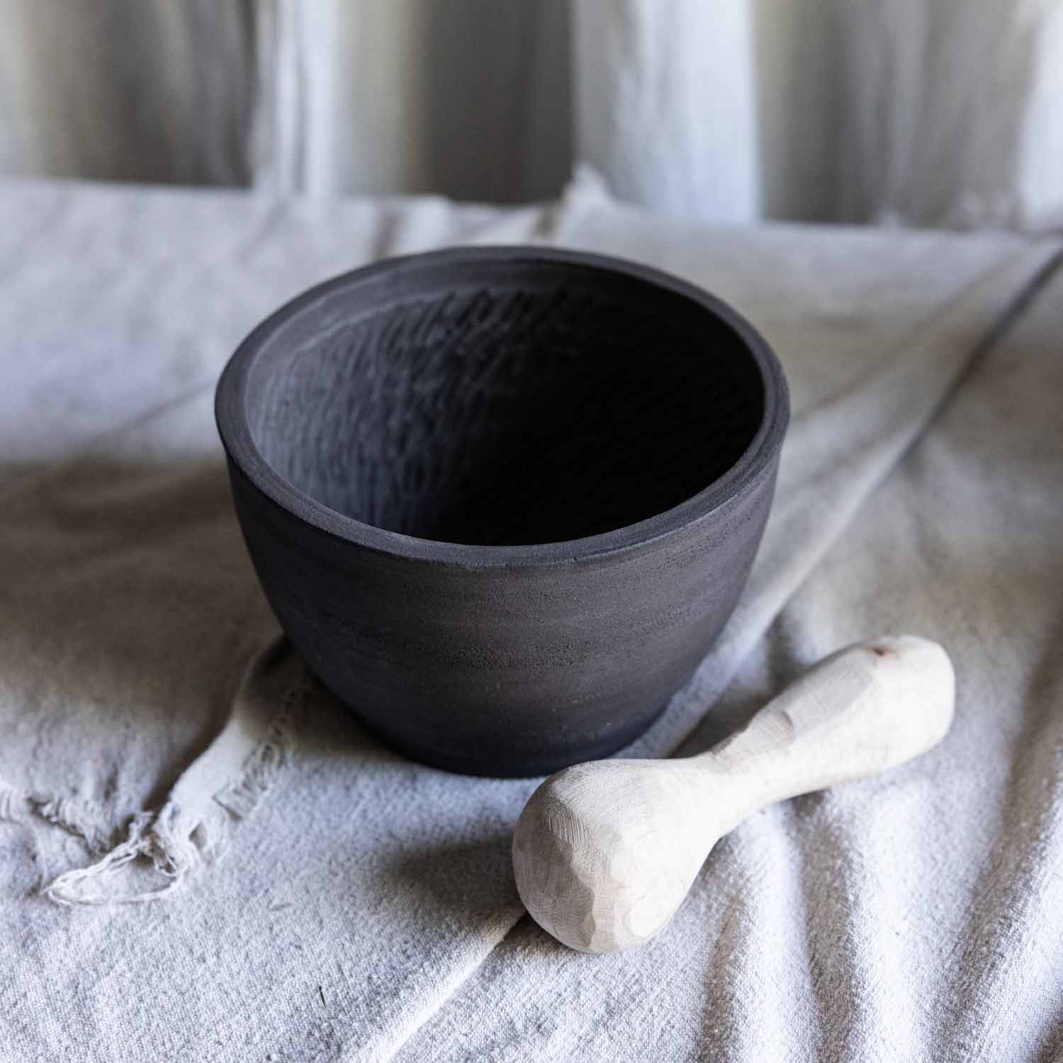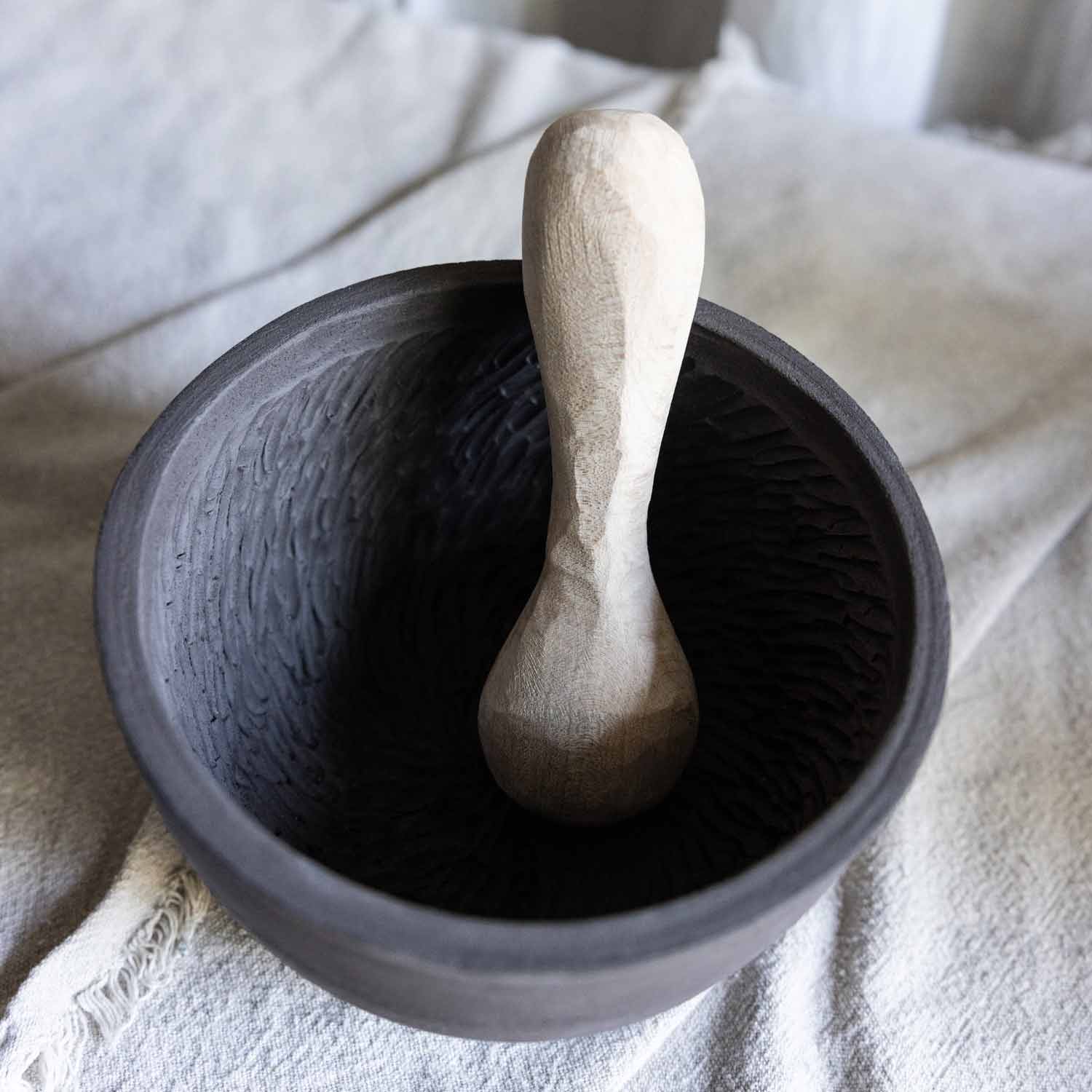Gefertigt aus schwarzem Ton und unglasiert ist jede Kerbe wie eine Messerklinge und somit ein absolutes Kraftpaket. Diesen Mörser wirst Du lieben!