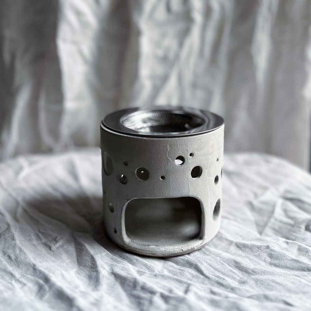 Dieses handgetöpferte Räucherstövchen aus betongrauem Ton mit einer matt-weißen Glasur ist neu im Stövchen-Katalog. Ein großes Einschubloch ermöglicht einen Teelicht-Wechsel ohne das Sieb vom Stövhen nehmen zu müssen.