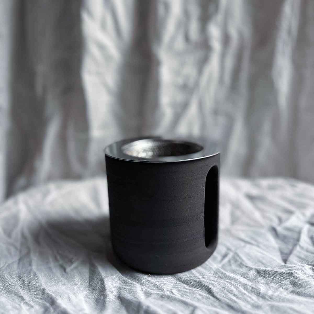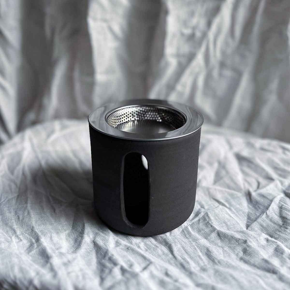 Dieses handgetöpferte Stövchen aus mattschwarzem Ton ohne Glasur sorgt ab jetzt für ein Statement in deinen Räumen. Die großen Luftschlitze verleihen dem Stövchen ein geradliniges Äusseres.